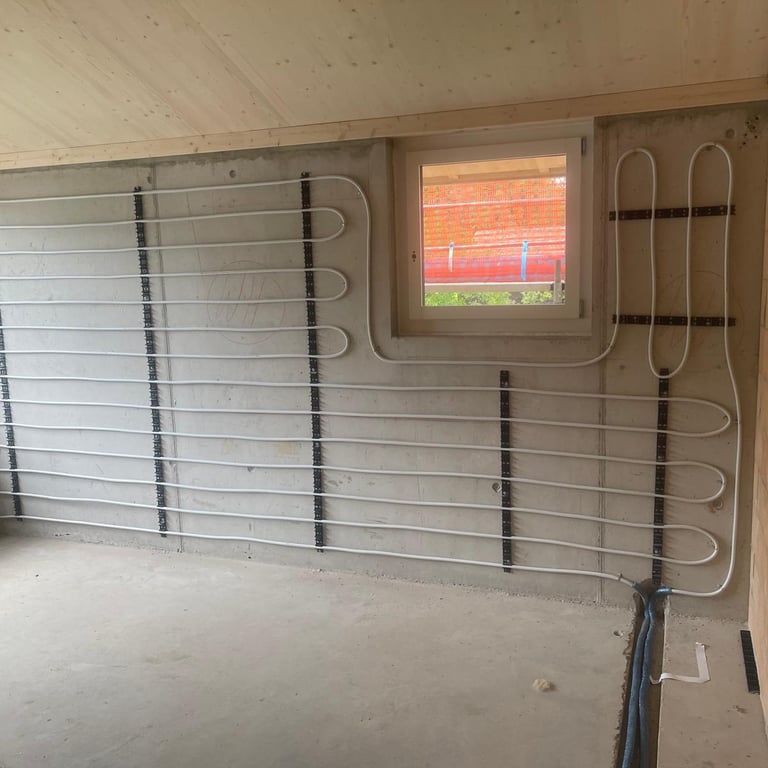 Die Wandheizung sorgt für eine gleichmässige und angenehme Strahlungswärme im Raum. Heizrohre werden direkt in der Wand integriert und geben die Wärme grossflächig ab. Dadurch entsteht ein behagliches Raumklima bei gleichzeitig hoher Energieeffizienz und optimaler Nutzung der vorhandenen Flächen.